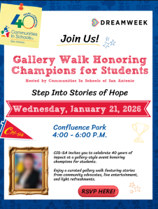 We’re excited to host a Dreamweek event – the Gallery Walk Honoring Champions for Students – in collaboration with Communities In Schools of San Antonio, as they celebrate 40 years of impact! 🎉